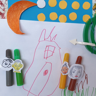 The prop made by grandma but the baddy and the house drawings done by my 3 year old