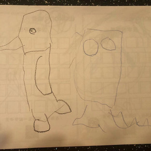 Pic 11, age 4, what looks like penguin or fish is mummy's drawings, all unrecognised items are kid's drawings