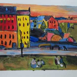 We use Cadium yellow, cadium red, ultrmatine blue, white, black. Black outlines fill rich colours